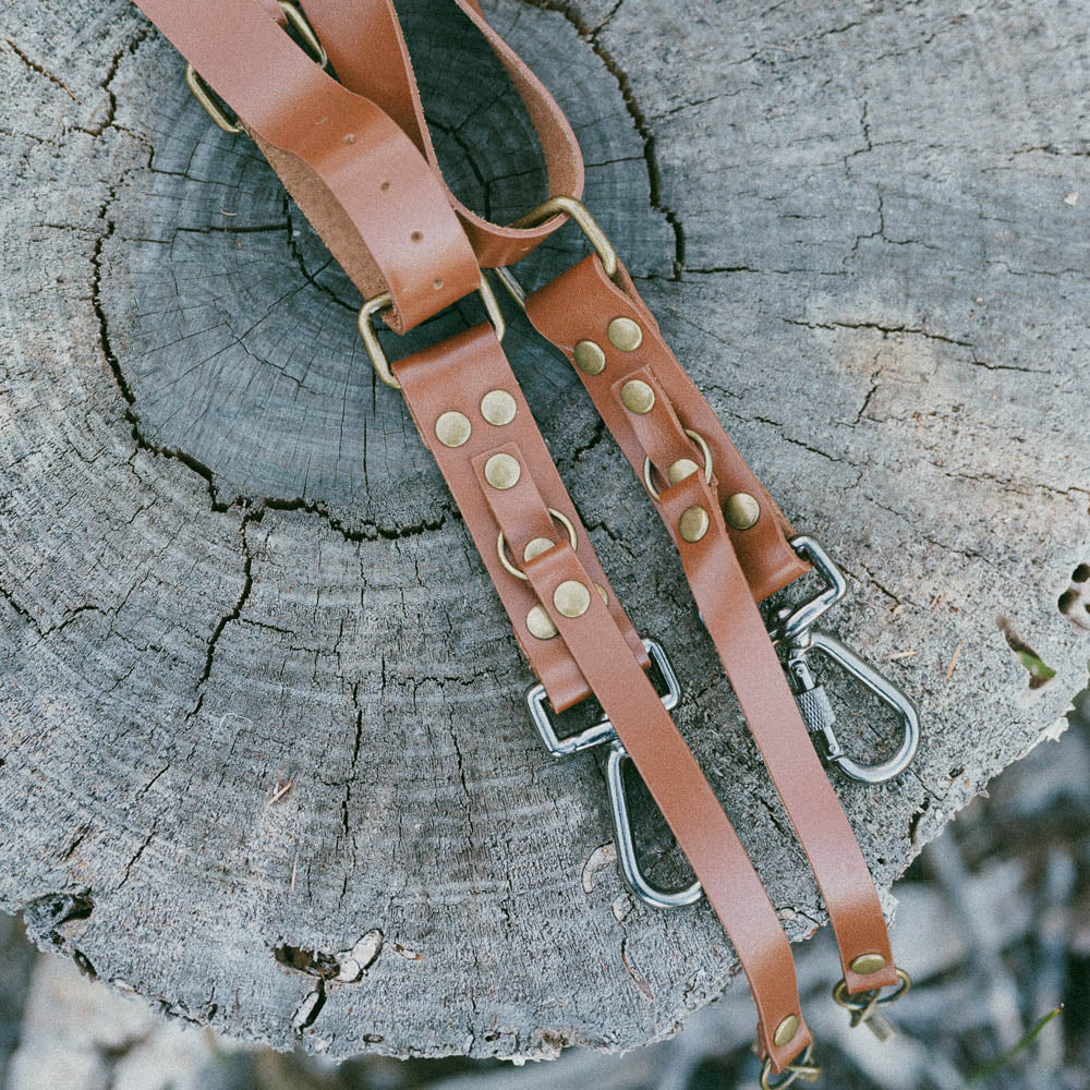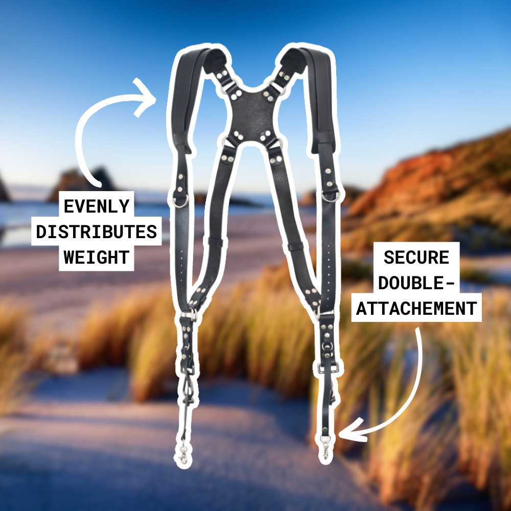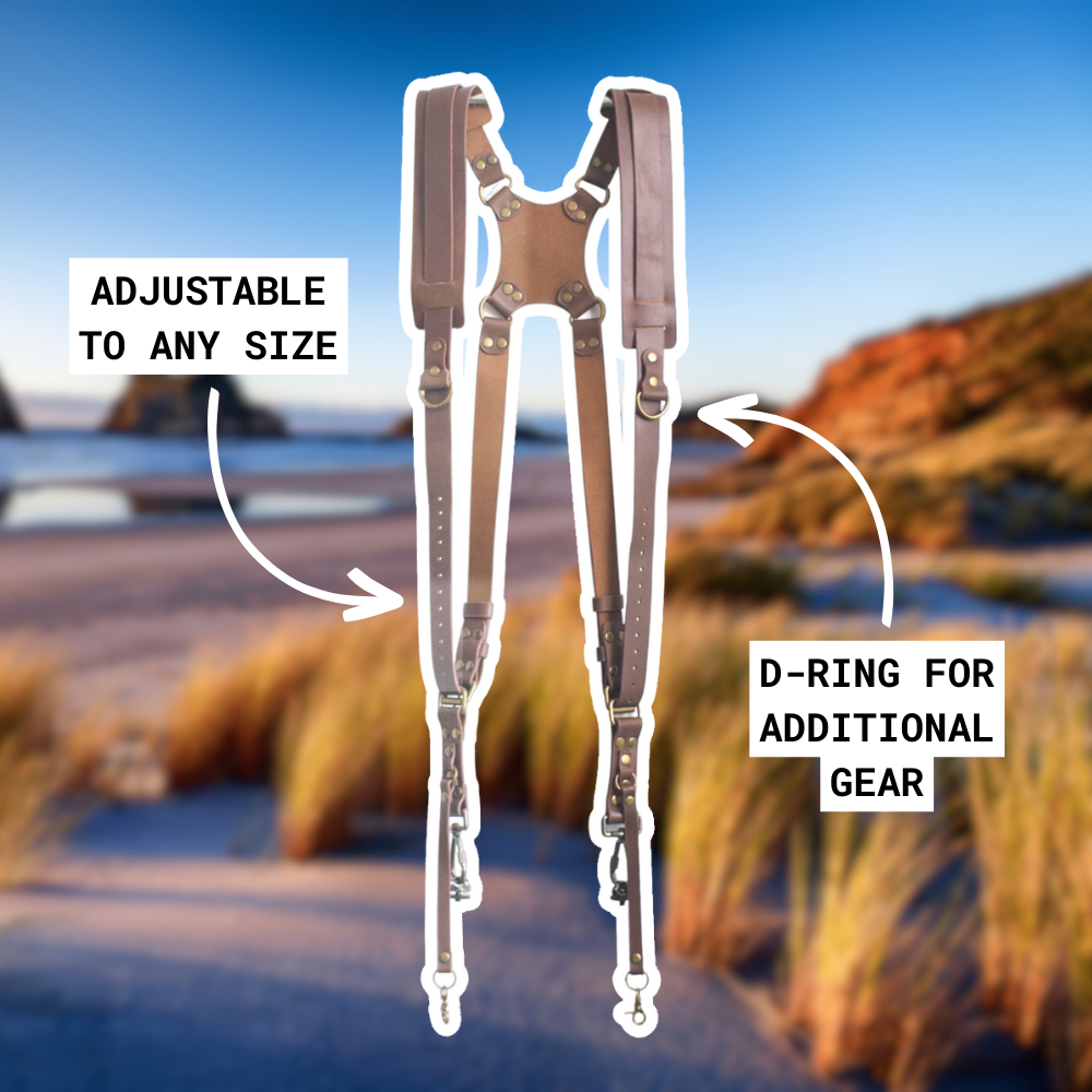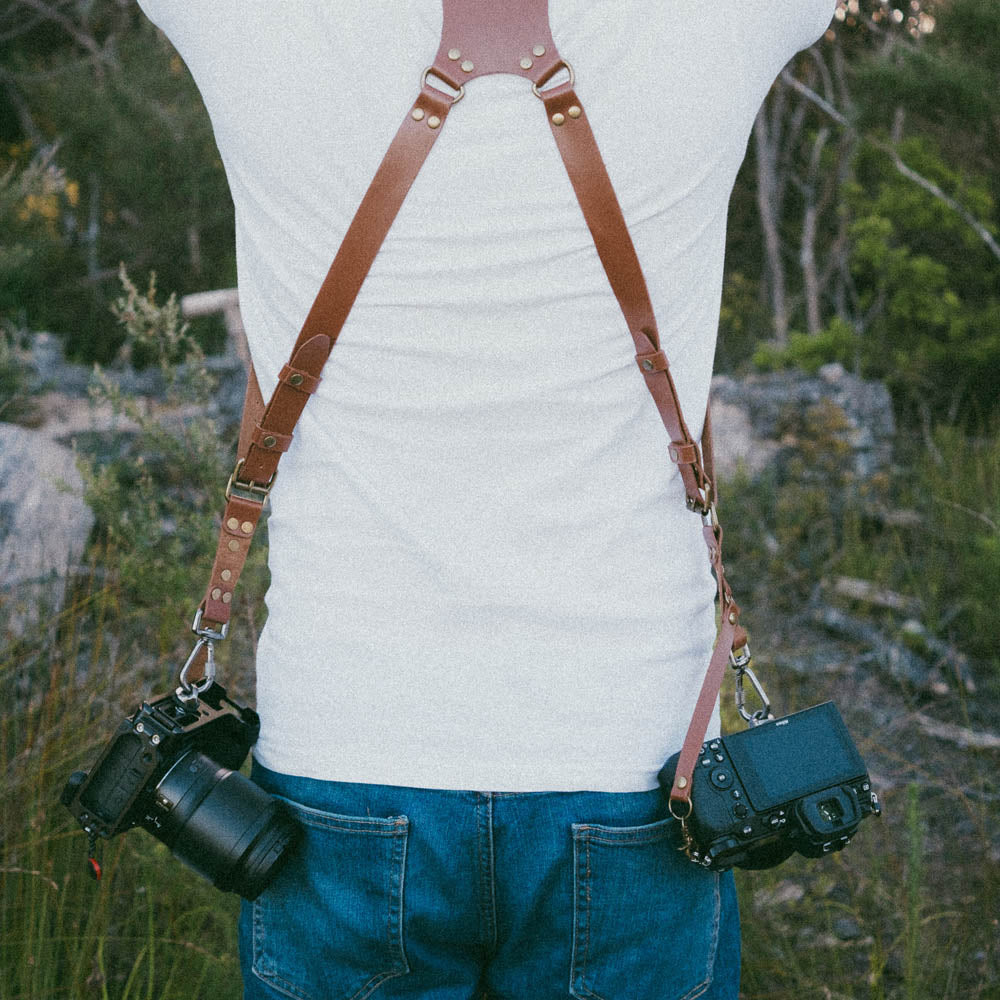 It's fully adjustable, allowing it to fit photographers of all sizes and shapes. The leather straps are designed to fit comfortably around the shoulders, with a secure buckle ensuring that the cameras remain in place - no matter what you're doing.